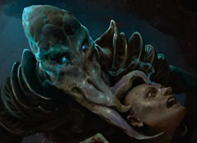 The hunt started as soon as Vezzim heard and felt the music. Something primal stirred within the Illithid, his hunger awoke and he would absorb answers. Vezzim had found this elf on the Titan's plateau, a trained mind and truly delicious head apple. All of the doomed elf's thoughts were on his lost professor, a magician of even greater skill who had recently been sacrificed to a devil of great power. This tasty elf wasn't even nobel, a fact that frustrated Vezzim. The elf's memories were approaching a point of uselessness leading Vezzim to the realization that his hunt was far from over. Vezzim wanted to figure out the source of this ancient song, what its vibrations meant. He must have his own answers before communing with the Eldar. The Mind Flayer released the elf's husk of a body. The meat sack of flesh falling and sinking into the lake waters Vezzim levitated above while the Illithid considered his options. The Flayer decided he would spend another day enjoying the delicacies of the plateau, hoping one of these apprentice wizards might provide him the information he needs. If he failed to acquire satisfactory answers, he would contact Bathanon! Surely that elf will have the answers.